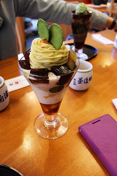 又一道繽紛的甜點おいもさんパフェ(おいもさんぱふぇ)(1,167日圓),但是我覺得它更可憐了。因為它甚至沒有抹茶冰淇淋,只有二片薄薄的抹茶餅乾,但是它卻有宇治抹茶、宇治玄米茶、宇治ほうじ茶等三種茶的元素在裡面,還蠻值得一試的。
