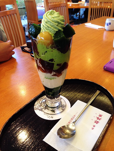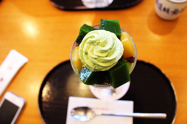 它,果然是間厲害的店,平常日的下午一樣排滿人。不過,排再久都無所謂,就是不能沒吃到就回家,我想愛抹茶的人絕對可以理解。來到這麼厲害的店,當然要試試最厲害的甜點。Ai San馬上體會我的心情,直說這款都路里パフェ(つじりぱふぇ)(1,178日圓)是她的最愛。二話不說,我就要它了。