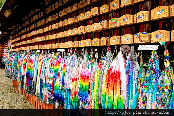 這次我沒有急著走上那條紅頂路,因為一上本堂就被「東丸神社」內鮮艷的花束吸引。近看,原以為的花束原來是由許多不同顏色的迷你紙鶴串連而成的,每隻小紙鶴都是學子的殷殷期盼。雖然不知道怎麼稱呼它,但是這數大的美緊緊抓住了我的目光。