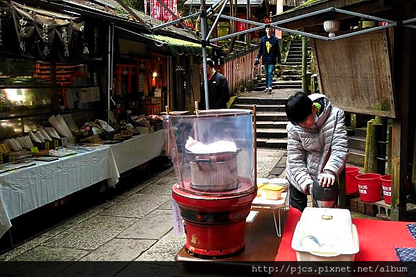 大部分要攻頂的人都會選擇往一峯上社的方向前進,我們偏偏就想與眾不同,來個反方向(其實是偷懶)。雖然接下來突發的事迫使我不得不放棄這次的攻頂計劃,我們還是挺進到「藥力社」。藥力社中奉拜的是保嗓的咳嗽大神,因此吸引大批的歌舞伎名角前來參拜,神社後甚至有個供人修行的「藥力瀧」瀑布。但是我這個文化白癡,卻只注意到眼前熱騰騰的茶葉蛋。老闆說它是用「藥力瀧」煮的,吃完再配上用「藥力瀧」泡的茶,一整年都會健健康康的~嗯,所以每年都要去吃一次的意思囉!