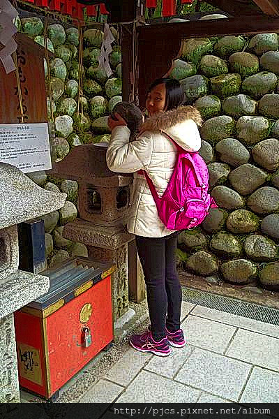似懂非懂的逛完本堂後,再度踏上鳥居路。嚴寒的二月天,鳥居路顯得清靜許多,卻依然人來人往,還是找不到沒有路人當背景的拍照空檔。所以我們快速的進入「奧社奉拜所」,這次我沒忘了輕重石,滿心期待的去驗證它的傳說~我只能說「信者恆信」。