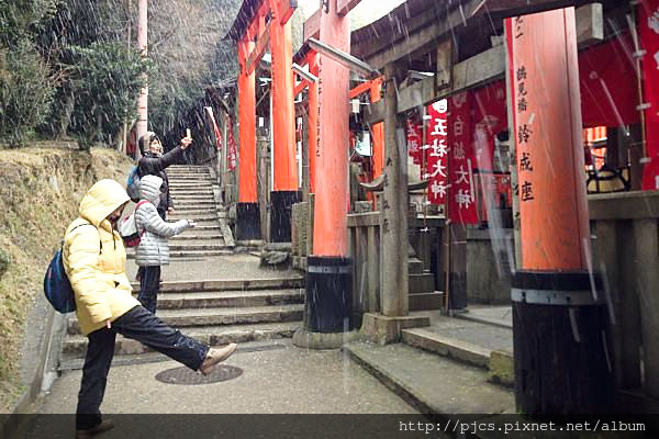 因為開始飄落的細雪和山下等候的家人,只好不情不願的結束我的二訪。回程時,雪越來越大,讓我們不時停下腳步,享受有生以來的首降雪。寧靜的稻荷山,在雪白的世界中更增添了一股神秘和靜肅,遊客都不約而同的用眼神表達心中的激動。